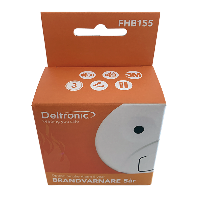 Deltronic FHB 155 är en liten optisk brandvarnare utvecklad för ett enkelt och tryggt användande. FHB 155 är lätt att montera med bifogad 3M dubbelhäftande tejp på släta tak. Är taket skrovligt, använd medföljande skruv och plugg i stället. Deltronic FHB 155 reagerar på pyrande bränder i de vanligaste material vi har i våra bostäder. Reagerar snabbt med kraftig signal (85 dB på 3 meter). 5-års batteri.
